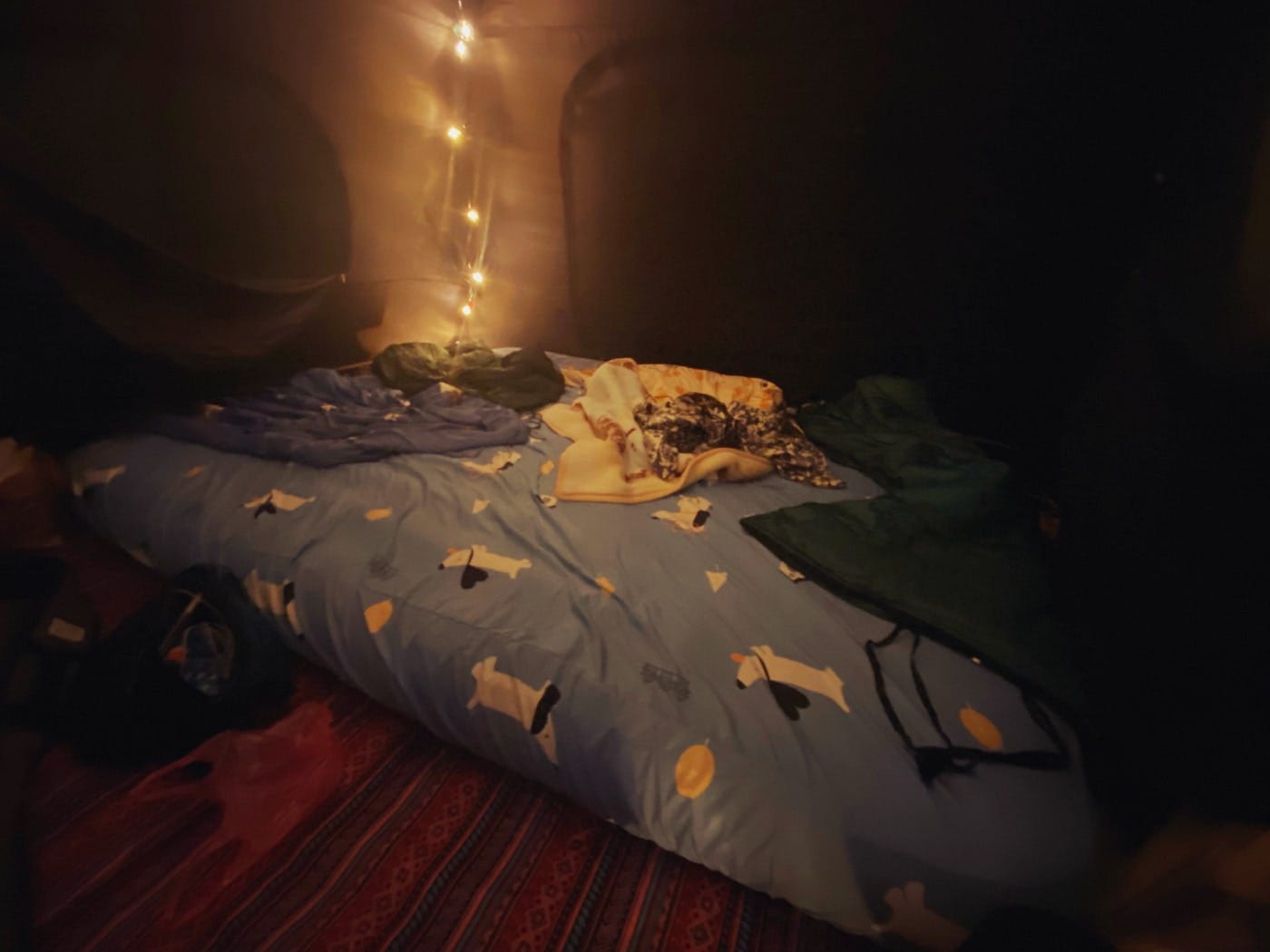 第二次去露營,是有一個老手帶領我們。他給我一張二手充氣床、又給我一些防水布。他幫我一起把帳篷搭起來,也幫我把充好充氣床,我心裡想應該能睡好了吧!