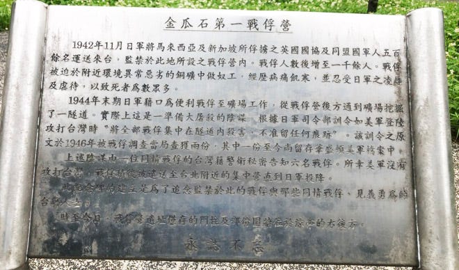 隱藏在金瓜石的山裡的紀念公園的某個角落,有一個「金瓜石第一戰俘營」的碑文。其中的故事讓我印象深刻。