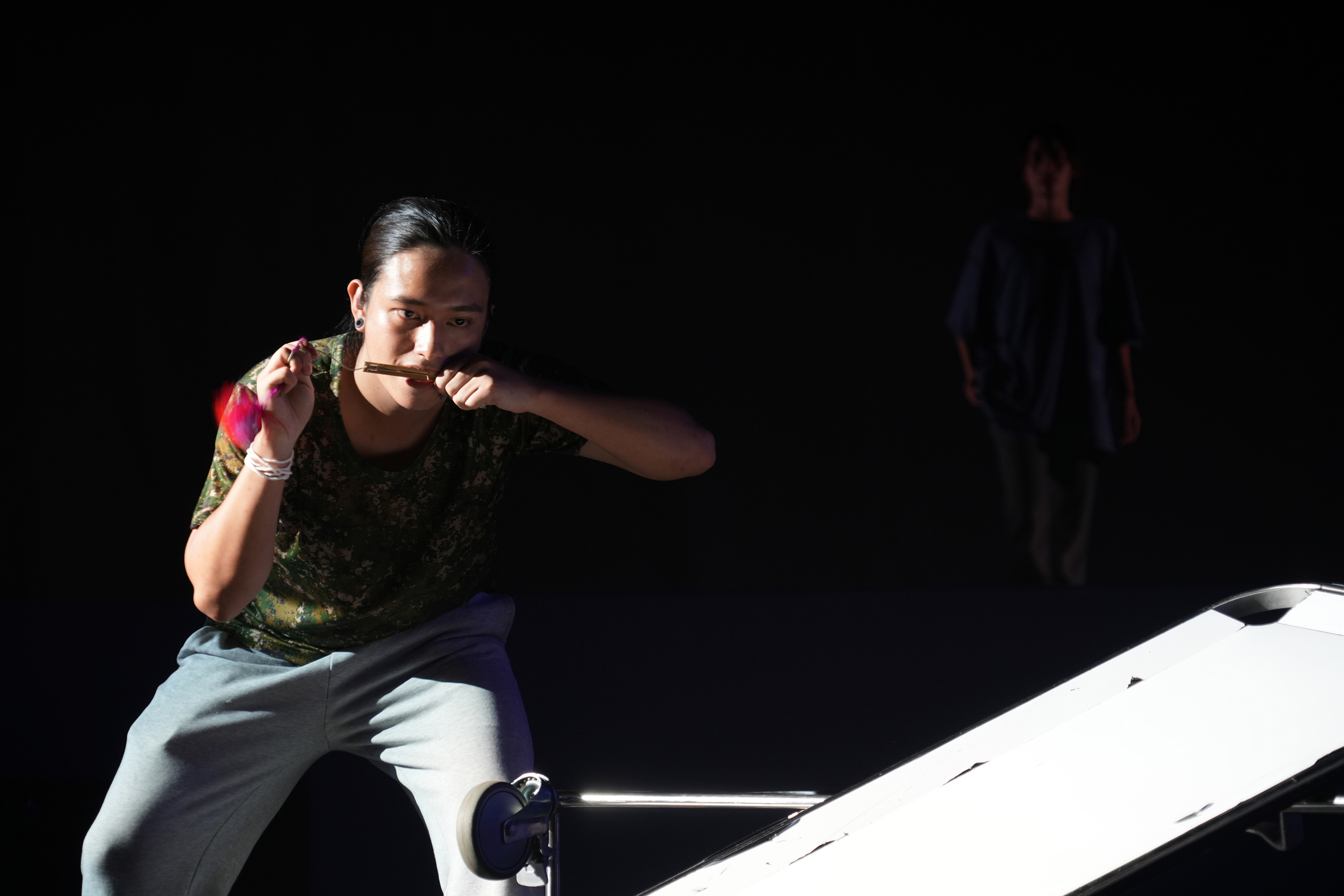 兩年前,我也想帶著小脉到劇場的後台看看。記得兩年前在北藝中心演出前,我牽著她到藍盒子裡(是從後台進去的),沒想到她一進劇場裡,看見黑漆漆的黑盒子,以及燈光、煙機的變化,嚇到全程閉起眼睛抱緊我,怎樣都不肯從我身上下來。