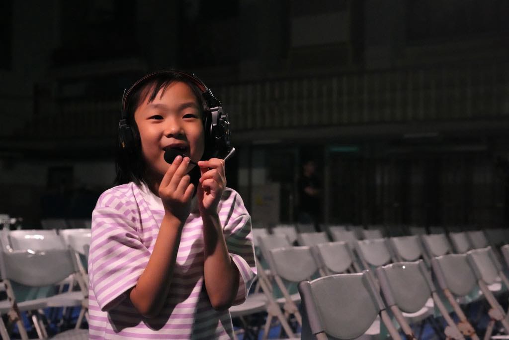對劇場工作者來說,「進劇場」相對於劇本創作、演出和行政工作等,就是另一種工作步調。從架設音響、燈光、舞台、一直到調燈、set Cue⋯⋯等等,連續工作12小時是常態,連吃飯時間都是有行程表的規劃。在金山高中的演出,是我第一次帶著女兒全程跟著我們一起工作。